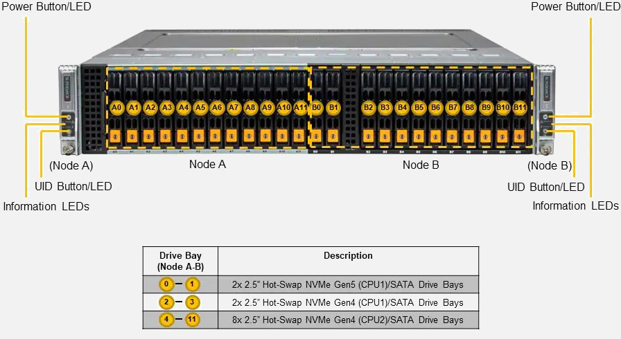 Ideal for High-Performance File System, Diskless HPC Cluster, Big Data Analytics and AI. Dual Node 2U Form Factor. Redundant 2200W Power Supply, 12x 2.5" hot-swap NVMe/SATA drive bays (Per Node)