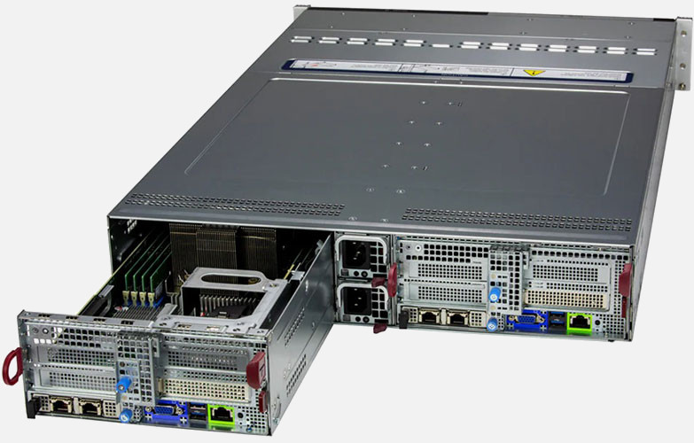 This 2U Twin delivers an innovative architecture where devices can be hot-swapped to allow for easier maintenance, to reduce/eliminate down time and to save space and energy.