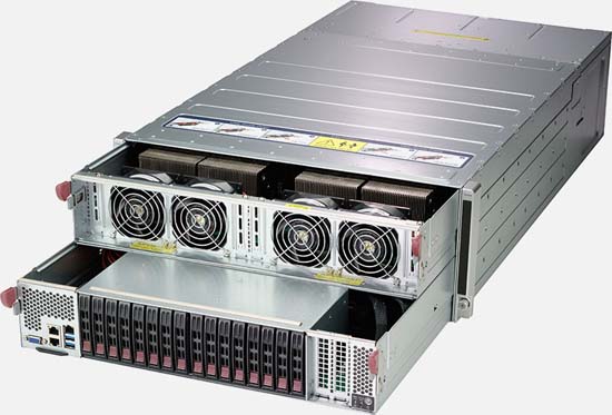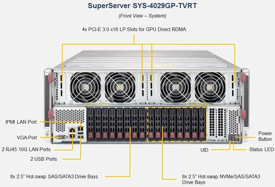 Supports 8x Tesla V100 with 300GB/s NVLINK, Dual 10GBase-T LAN with Intel X540, 16x Hot-swap 2.5" SAS/SATA drives and 8x NVMe drives