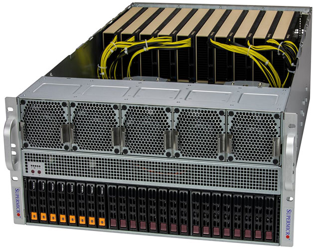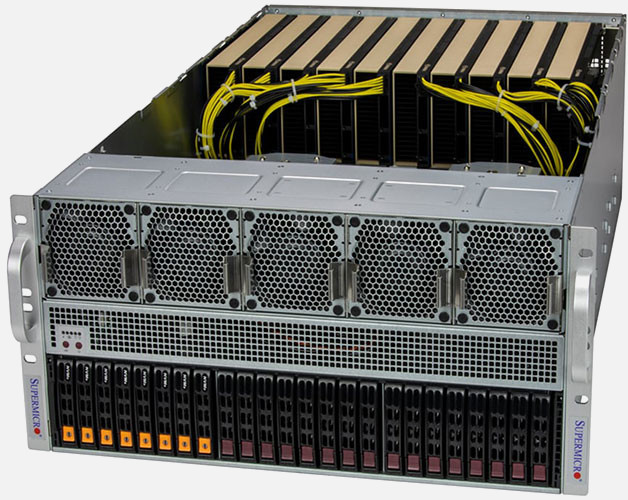 Ideal for HPC, AI, Deep Learning, cloud gaming, VDI, rendering and animation. 13x PCI-E 5.0 x16 slots. Redundant 2700W Titanium Power Supply, 24x 2.5" hot-swap NVMe/SATA drive bays