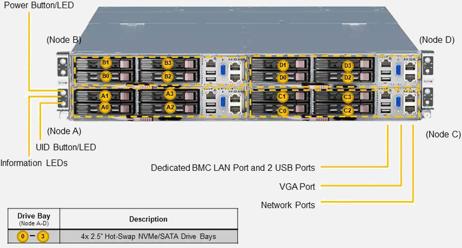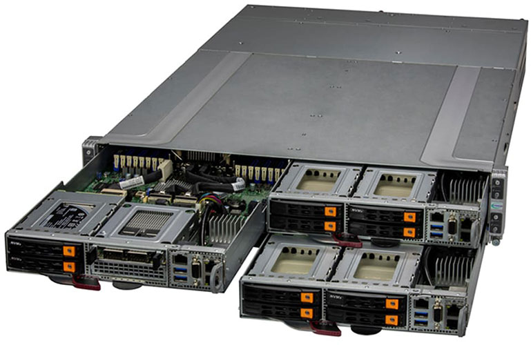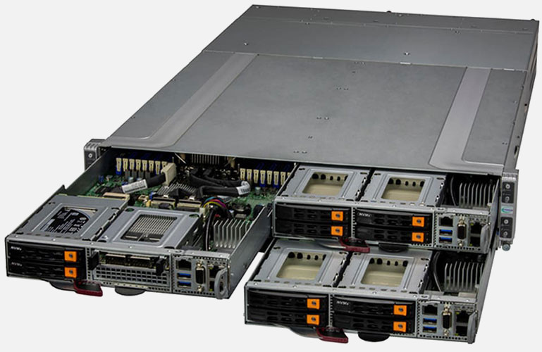 Ideal for HPC, MEC, Cloud Gaming, Multi-purpose CDN, High-availability Cache Cluster and EDA. Quad Node 2U Form Factor. Redundant 2200W Power Supply, Up to 4x 2.5" hot-swap NVMe/SATA drive bays (Per Node).