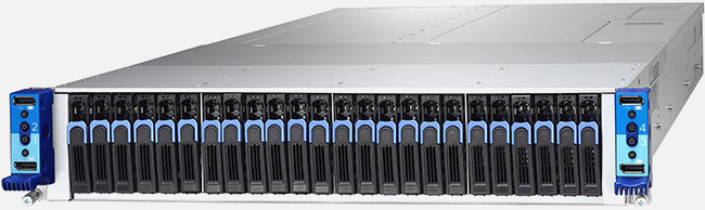 2U4N 2S 24-SFF NVMe/SATA HCI Server. 64 DIMM slots, 16 per sled. 1 HH/HL PCIe x16 + 1 HH/HL x8 slots per sled.