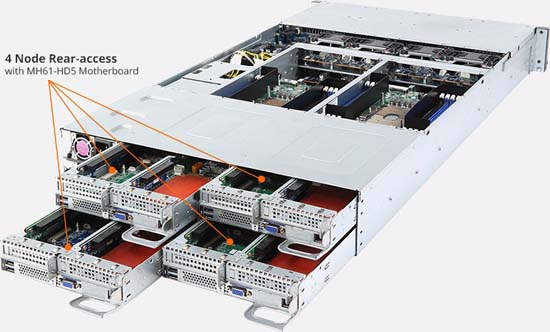 2U - 4 nodes with rear access to the node trays, 12x 3.5" SAS/SATA hot-swappable HDD/SSD bays, 8x Low profile PCIe Gen3 expansion slots