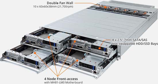 2U - 4 nodes with front access to the node trays, 8x 10Gb/s BASE-T LAN ports (Intel® X550-BT2), 4x front side and 8x rear side low profile PCIe Gen3 x16 expansion slots