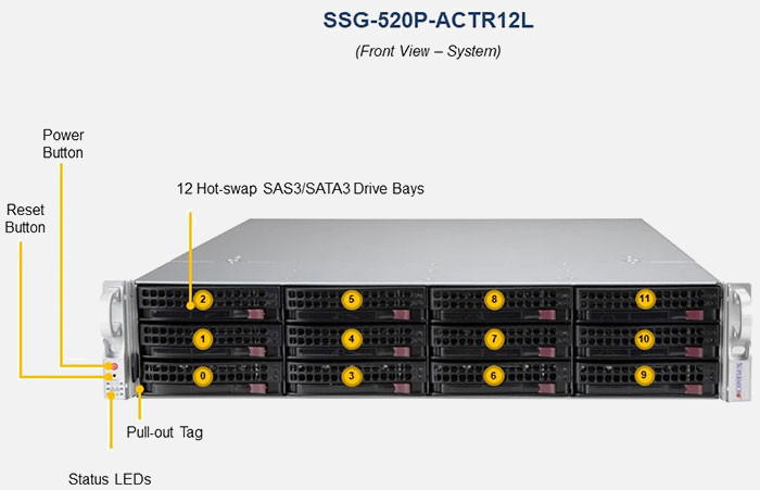 The Supermicro UP Storage SuperServer SSG-520P-ACTR12L | SSG-520P-ACTR12L features hot-swap hard drives, giving you more flexibility and allowing you to remove drives without having to shut down the system.