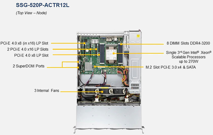 A 2U Supermicro SuperServer based on 1x Intel 3rd Gen Intel Xeon Scalable Processor (X12) range of processors, the Supermicro UP Storage SuperServer SSG-520P-ACTR12L | SSG-520P-ACTR12L is configurable with up to 12x Hot-Swap Drives drive bays, and designed for optimal performance with 8x 3200Mhz DDR4 memory sockets .