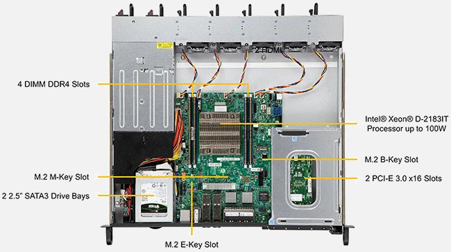 Optimised for Multi-Access Edge Computing and AI Artificial Intelligence. 2 PCI-E 3.0 x16 (FHFL) slots. 9 GbE (1 port for management), 4x 10G SFP+, and 1 Dedicated IPMI LAN.