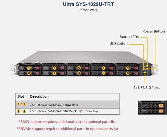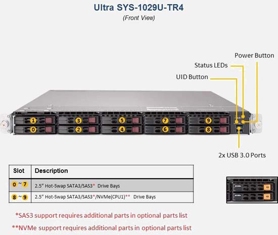 The Supermicro SuperServer 1029U-TR4 | SYS-1029U-TR4 can be configured with 2.5" drives, a more space efficient and low noise option. These drives also offer energy savings and increased flexibility.