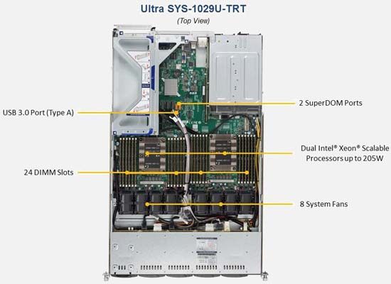 The Supermicro SuperServer 1029U-TR4 | SYS-1029U-TR4 supports the Intel Xeon Scalable Processors 2nd Generation family in a high-density 1U form-factor. These SuperServers are ideal for network infrastructure, front-end enterprise, and minimal-downtime cluster server systems.