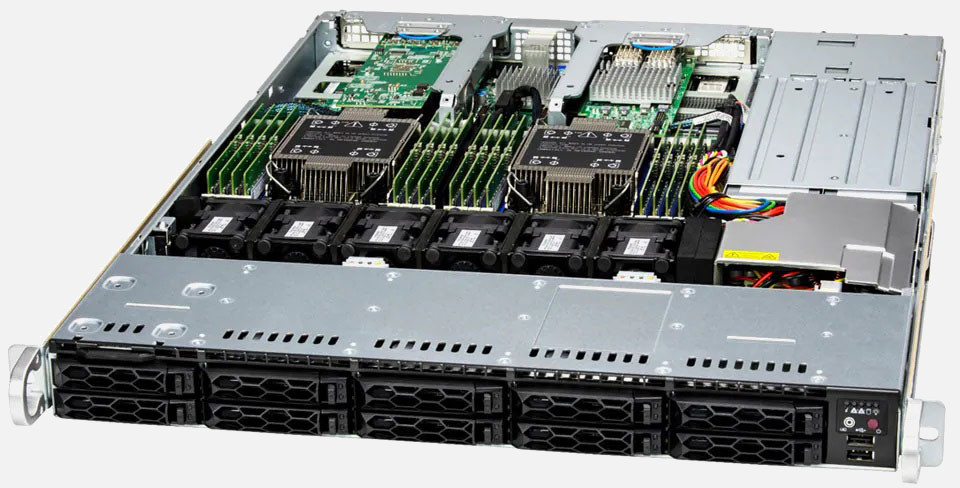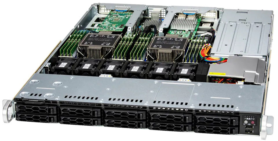 Ideal for cloud computing, CDN, Edge, Web server . 2x PCI-E 5.0 x16 slots. 800W/860W Redundant power supply, 10x 2.5" NVMe/SATA/SAS drives