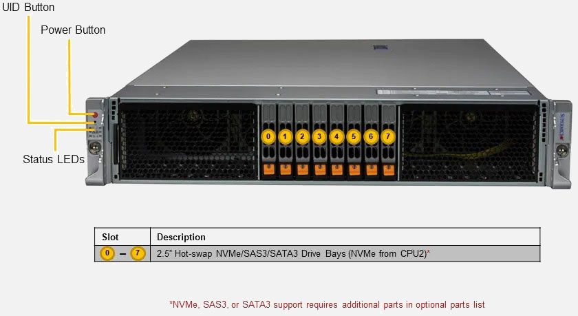 The Supermicro Hyper SuperServer 221H-TNR | SYS-221H-TNR can be configured with 2.5" drives, a more space efficient and low noise option. These drives also offer energy savings and increased flexibility.