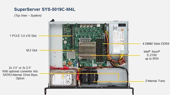 The Supermicro SYS-5019C-M4L SuperServer | 5019C-M4L supports the Intel Intel Xeon E 2100 Series , Intel Xeon E 2200 Series family in a high-density 1U form-factor. These SuperServers are ideal for network infrastructure, front-end enterprise, and minimal-downtime cluster server systems.