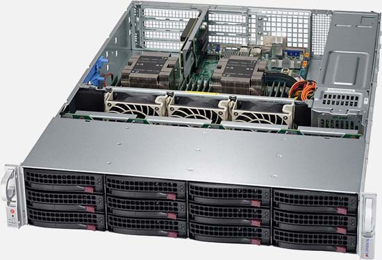 This system can be configured with up to 1.5TB of RAM and up to 12x hot-swap 3.5 SAS/SATA drives. It is equipped with 1x PCI-E x16 and 4x PCI-E x8 expansion slots, as well as 1200W redundant power supplies. For networking it features 2x 10GBase-T ports via Intel C622.