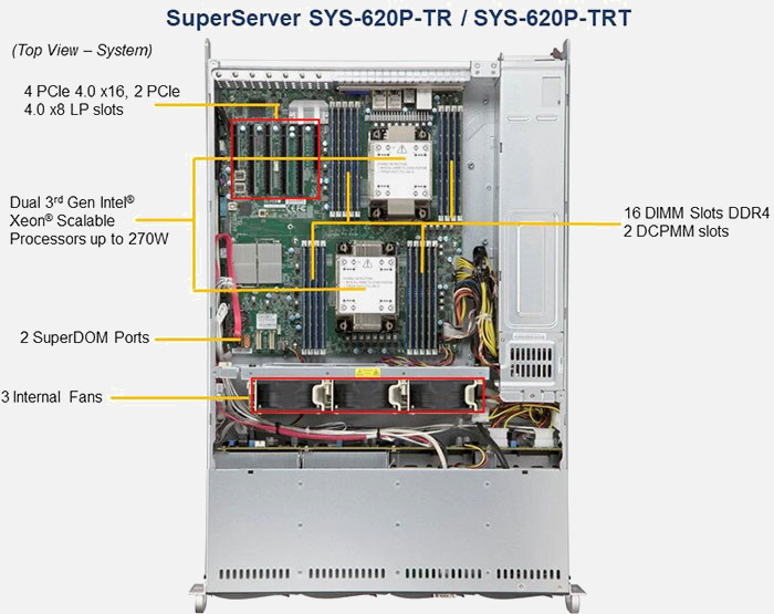 The Supermicro SuperServer SYS-620P-TR | SYS-620P-TR supports the Intel Intel Xeon Scalable Processors 3rd Generation family in a high-density 2U form-factor. These SuperServers are ideal for network infrastructure, front-end enterprise, and minimal-downtime cluster server systems.