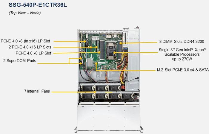 A 4U Supermicro SuperServer based on 1x Intel 3rd Gen Intel Xeon Scalable Processor (X12) range of processors, the Supermicro UP Storage SuperServer SSG-540P-E1CTR36L | SSG-540P-E1CTR36L is configurable with up to 36x Hot-Swap Drives drive bays, and designed for optimal performance with 8x 3200Mhz DDR4 memory sockets .